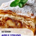 Classic Austrian Apple Strudel featuring thin, buttery layers of phyllo dough filled with a spiced apple mixture enhanced with raisins and nuts. Baked to golden perfection and dusted with powdered sugar for a delightful, warm dessert.