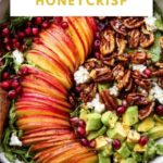 A vibrant and flavorful Autumn Harvest Honeycrisp Apple and Feta Salad combining crisp Honeycrisp apples, creamy avocado, crunchy toasted pecans and pumpkin seeds, sweet-tart pomegranate arils, and salty prosciutto. Tossed with a tangy apple cider vinaigrette and topped with crumbled feta cheese, this salad is perfect for celebrating fall’s freshest flavors with a delightful balance of sweet, savory, and spicy notes.