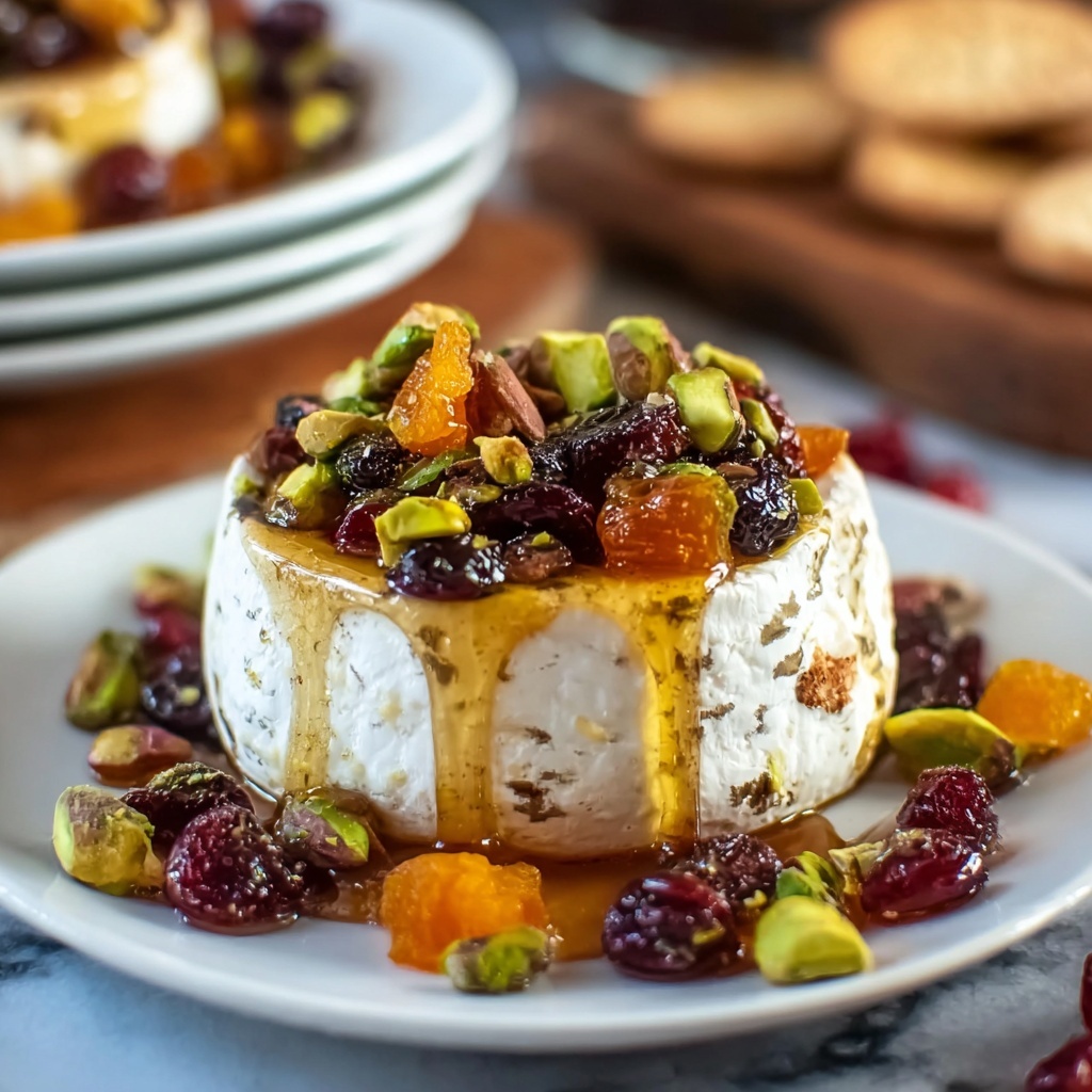 A deliciously warm and gooey baked Brie cheese topped with a honey drizzle and a delightful mix of dried fruits and nuts, perfect for an elegant appetizer or cozy snack.