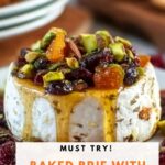 - Top the baked Brie: Remove the Brie from the oven carefully, and immediately top it with the dried fruit and nut mixture. Drizzle the remaining 1 tablespoon of honey over everything for added sweetness.