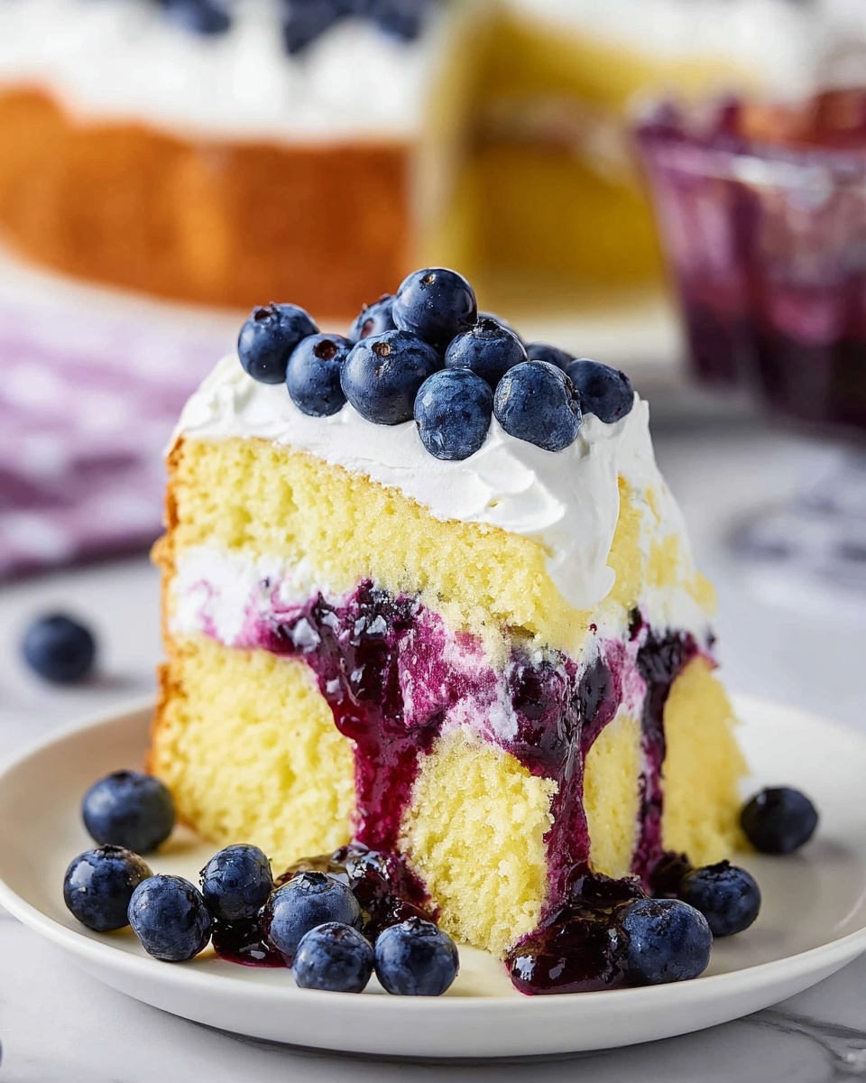 - Top with Lemon Curd and Whipped Topping: Dollop the lemon curd over the blueberry filling and spread it gently. Finally, spread the whipped topping evenly over the entire cake.