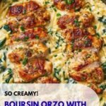 This creamy Boursin Orzo with Chicken is a comforting, flavorful one-pan dish. Tender chicken breasts are seasoned and pan-seared to a golden roast, then combined with toasted orzo pasta cooked in chicken broth and finished with a rich sauce of heavy cream and Boursin Garlic & Fine Herbs cheese. Fresh spinach adds a vibrant touch, and a sprinkle of Parmesan and parsley on top make this a perfect weeknight dinner ready in just 30 minutes.