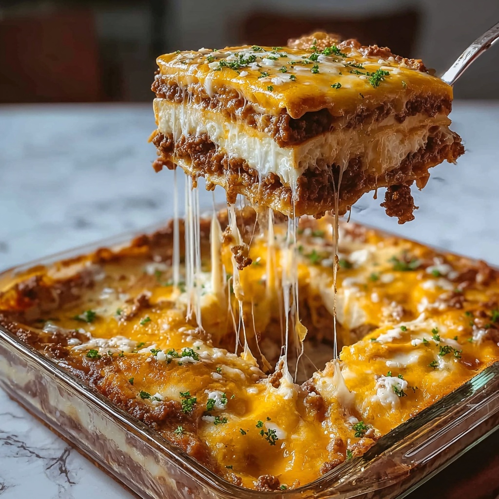 Cattle Drive Casserole is a hearty, layered baked dish combining seasoned ground beef, a biscuit crust, a creamy sour cream and cheese mixture, topped with salsa and melted cheddar cheese. This comforting casserole brings together bold flavors and textures for a satisfying meal perfect for family dinners.