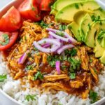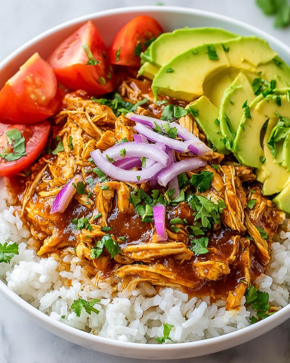 Now it’s time to build the bowls! Start with a generous scoop of cauliflower rice or brown rice as the base. Spoon over the flavorful chicken enchilada mixture, then layer with diced avocado, chopped tomatoes, and thinly sliced red onion. Sprinkle your chosen cheese and jalapenos on top to your taste.