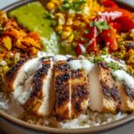 Begin to build your bowls by spooning a generous serving of your chosen rice into each bowl. Next, pile on the chicken and vegetable mixture, letting those vibrant colors and spices shine. Now for the finishing touches!