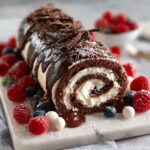 A decadent Choco Swiss Roll Delight featuring a rich cocoa sponge cake rolled with a fluffy chocolate cream filling, topped with a smooth chocolate ganache and garnished with chocolate shavings, fresh berries, and edible gold leaf. Perfectly light yet indulgent, this elegant dessert is great for special occasions.