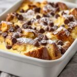 A decadent Chocolate Chip Bread Pudding made with buttery brioche or challah bread, soaked in a rich vanilla custard, baked to golden perfection, and served warm with a luscious homemade cream sauce.