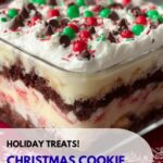 A festive and delightful Christmas Cookie Lasagna Dessert featuring layers of chocolate chip or gingerbread cookies, creamy cream cheese and whipped topping mixture, and topped with decorative chocolate chips or sprinkles. This no-bake, refrigerated dessert is perfect for holiday gatherings and offers a sweet, creamy treat with a fun layered presentation.