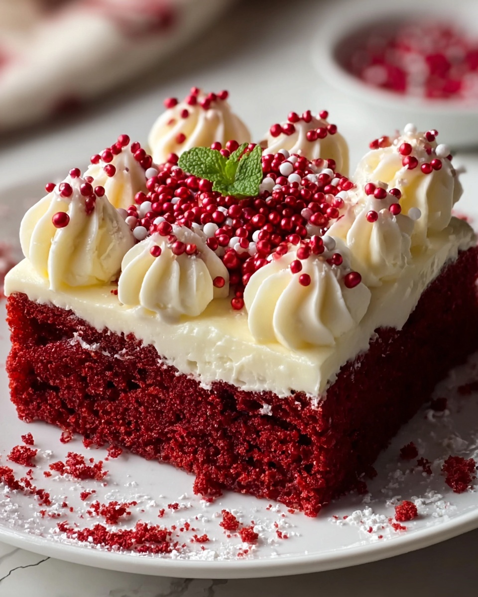 This festive Christmas Red Velvet Poke Cake combines the classic rich red velvet flavor with a luscious white chocolate and sweetened condensed milk drizzle that seeps into every bite. Topped with a creamy whipped cream cheese frosting and decorated with holiday sprinkles, this cake is perfect for celebrating the season with a moist, flavorful, and visually stunning dessert.