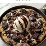 This Cookies Cream Skillet Cookie is a decadent dessert featuring a rich, buttery cookie dough loaded with multiple types of chocolate and crushed Oreo biscuits. Baked directly in a skillet, this treat has a golden crust with a gooey, chocolate-studded center, making it perfect for sharing. Topped with melted chocolates and served warm with cookies and cream ice cream, it offers a luscious combination of textures and flavors that will delight cookie and chocolate lovers alike.