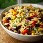 In a large mixing bowl, toss together the cooled orzo, diced tomatoes, bell peppers, red onion, canned corn, black beans, and fresh cilantro. Each component not only brings texture but also layers of fresh flavor and color, making this salad as pretty as it is tasty.