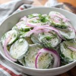 This Creamy Cucumber Salad is a refreshing and tangy side dish featuring thinly sliced cucumbers and red onions coated in a smooth sour cream dressing, enhanced with fresh dill and subtle spices. Perfect for a light, cool accompaniment to any meal or as a standalone snack, it’s quick to prepare and deliciously creamy without being heavy.