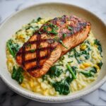 Ladle the creamy orzo into serving bowls and top each with a perfectly seared salmon fillet. Sprinkle chopped dill or parsley over the top for a fresh herbal note, and don’t forget to add lemon wedges on the side to brighten every bite even more.
