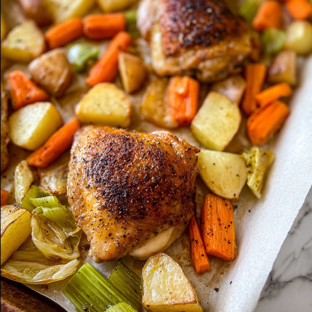 This recipe features crispy roasted bone-in, skin-on chicken thighs paired with a medley of tender, caramelized vegetables including Yukon gold potatoes, sweet potatoes, carrots, celery, and shallots, all marinated in a flavorful blend of olive oil, garlic, soy sauce, honey, and ground ginger. Perfectly roasted to achieve crispy skin and rich, savory flavors, this dish is a hearty and satisfying one-pan meal ideal for a comforting family dinner.