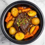 This classic Crock Pot Roast recipe features a tender and flavorful chuck roast slow-cooked with baby potatoes and carrots in a savory gravy. The roast is first seasoned and seared to develop a rich crust before being cooked with a blend of chicken and beef broths, herbs, and seasoning for a comforting and hearty meal perfect for family dinners.