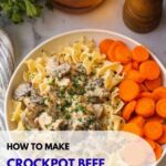 A comforting and creamy Crockpot Beef Stroganoff recipe featuring tender beef chunks slow-cooked with mushrooms, onions, and a rich mushroom sauce, served over wide egg noodles and garnished with fresh parsley. Perfect for an easy, flavorful weeknight dinner.