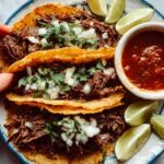 The key to elevating your birria tacos lies in fresh, bright garnishes. Top your tacos with diced white onions and chopped cilantro for a refreshing crunch and herbal aroma. Don’t forget lime wedges—they add an essential zesty pop that cuts through the richness perfectly.