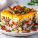 Evenly add the freshly shredded sharp cheddar cheese on top of the meat layer. The cheese melts slowly as the casserole cooks, wrapping all the layers in a luscious, melty embrace that’s downright irresistible.
