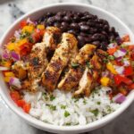 These Cuban Chicken & Black Bean Rice Bowls are a vibrant and delicious meal featuring tender, seasoned chicken breast sautéed with black beans, bell peppers, and onions served over fluffy rice. Enhanced with warm spices like cumin and paprika, and finished with fresh cilantro and tangy lime wedges, this dish offers a perfect balance of savory and fresh flavors in just 50 minutes.