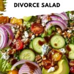 Divorce Salad is a fresh, vibrant, and healing salad recipe packed with mixed greens, cherry tomatoes, cucumber, avocado, red onion, feta cheese, and walnuts, all dressed in a simple balsamic vinaigrette. Perfect for a quick, nutritious, and flavorful meal that you can prepare in just 15 minutes.
