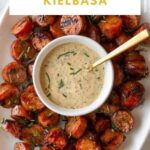 Once the kielbasa is cooked and crispy, transfer the pieces to a serving platter. Drizzle with a bit of the creamy dipping sauce or serve it on the side, topped with extra chopped chives for that fresh, vibrant touch.