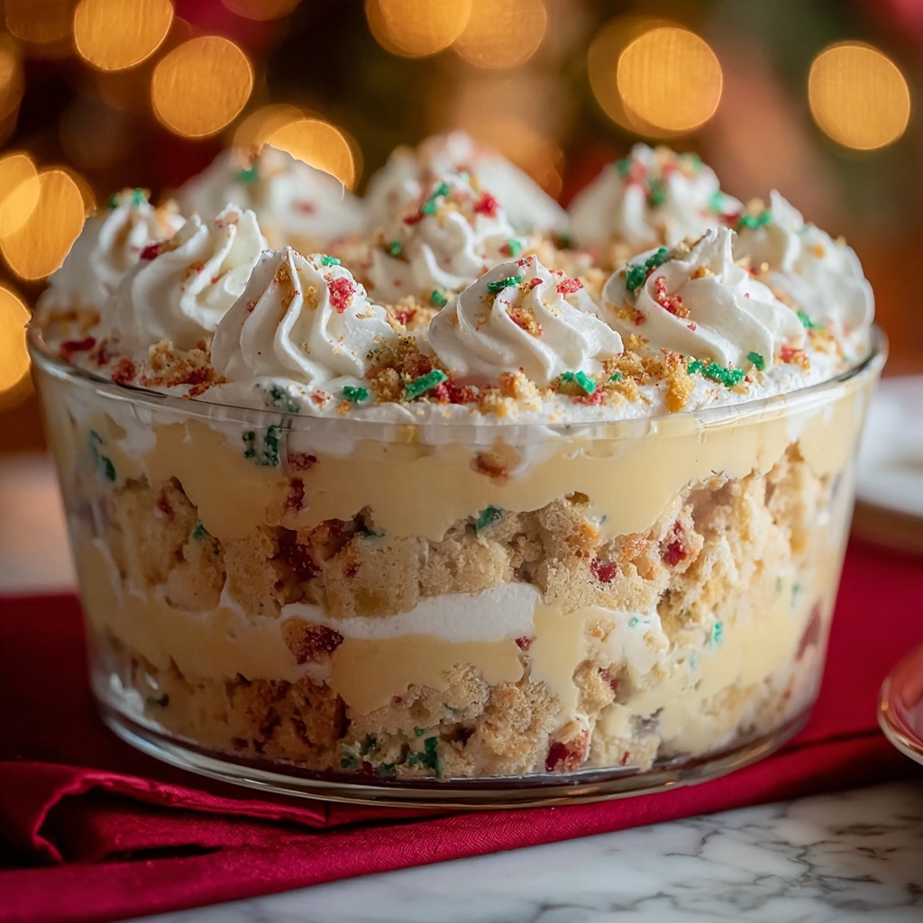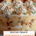 This Easy Christmas Cookie Lasagna features creamy, festive layers combining a buttery cookie crust, silky cheesecake filling, smooth vanilla pudding, and fluffy whipped topping, all adorned with colorful sprinkles and crushed cookies. A perfect make-ahead dessert for holiday gatherings that offers a rich, layered treat without baking.