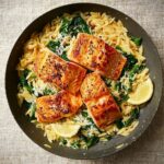 This Easy One Skillet Salmon Lemon Orzo is a delicious and creamy main course that combines perfectly seared salmon fillets with tender lemon-infused orzo cooked in a rich Parmesan cream sauce. Ready in just 30 minutes, it’s a perfect weeknight dinner that’s both satisfying and elegant.