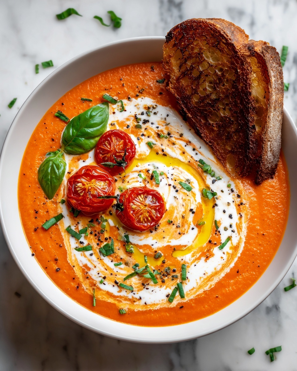 Fresh basil leaves are classic for a reason — they add a fragrant, slightly peppery note that complements the roasted tomato base. You can also try a sprinkle of grated Parmesan cheese for an umami boost or a swirl of cream for extra decadence.
