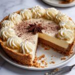 Serving your Eggnog Pie with Gingerbread Crust Recipe with simple yet elegant garnishes elevates its appeal instantly. A dollop of freshly whipped cream enhances the creamy texture, while crushed gingerbread cookies add delightful crunch and a burst of spice in every bite. A light dusting of freshly grated nutmeg adds visual charm and an aromatic lift, making the pie irresistible to both the eyes and palate.