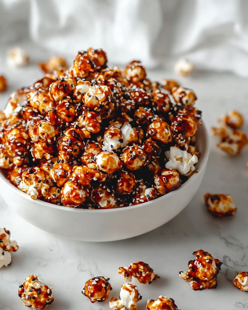 Gochujang Caramel Popcorn with Sesame Seeds is a delightful snack combining the sweet richness of caramel with the spicy kick of Korean gochujang chili paste. Toasted sesame seeds add a nutty crunch, making this treat an irresistible blend of sweet, spicy, and savory flavors perfect for movie nights or casual snacking.