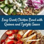 A vibrant and healthy Greek Chicken Bowl featuring juicy grilled chicken, fresh vegetables, and traditional Mediterranean flavors like oregano, feta, and tzatziki sauce. This easy-to-make recipe combines protein-rich grilled chicken with nutrient-packed quinoa or rice, perfect for a wholesome lunch or dinner.
