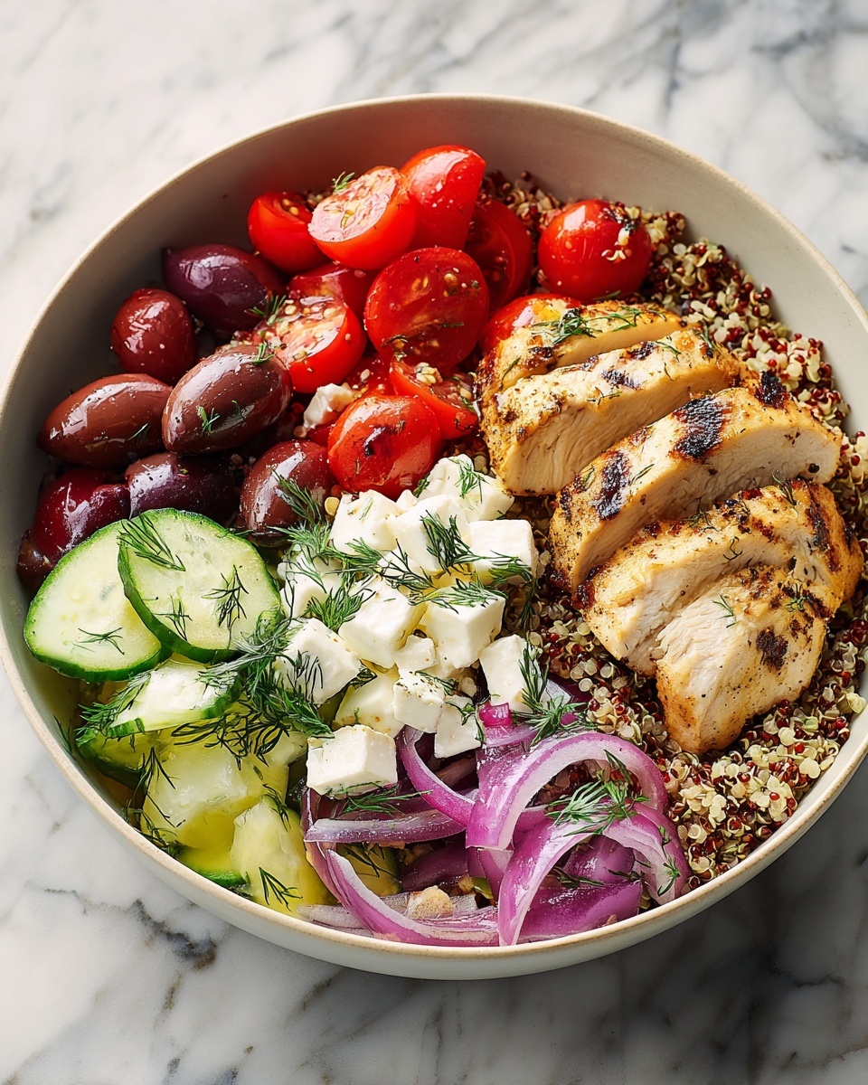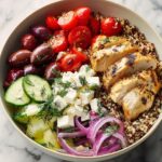 A vibrant and healthy Greek Chicken Bowl featuring juicy grilled chicken, fresh vegetables, and traditional Mediterranean flavors like oregano, feta, and tzatziki sauce. This easy-to-make recipe combines protein-rich grilled chicken with nutrient-packed quinoa or rice, perfect for a wholesome lunch or dinner.