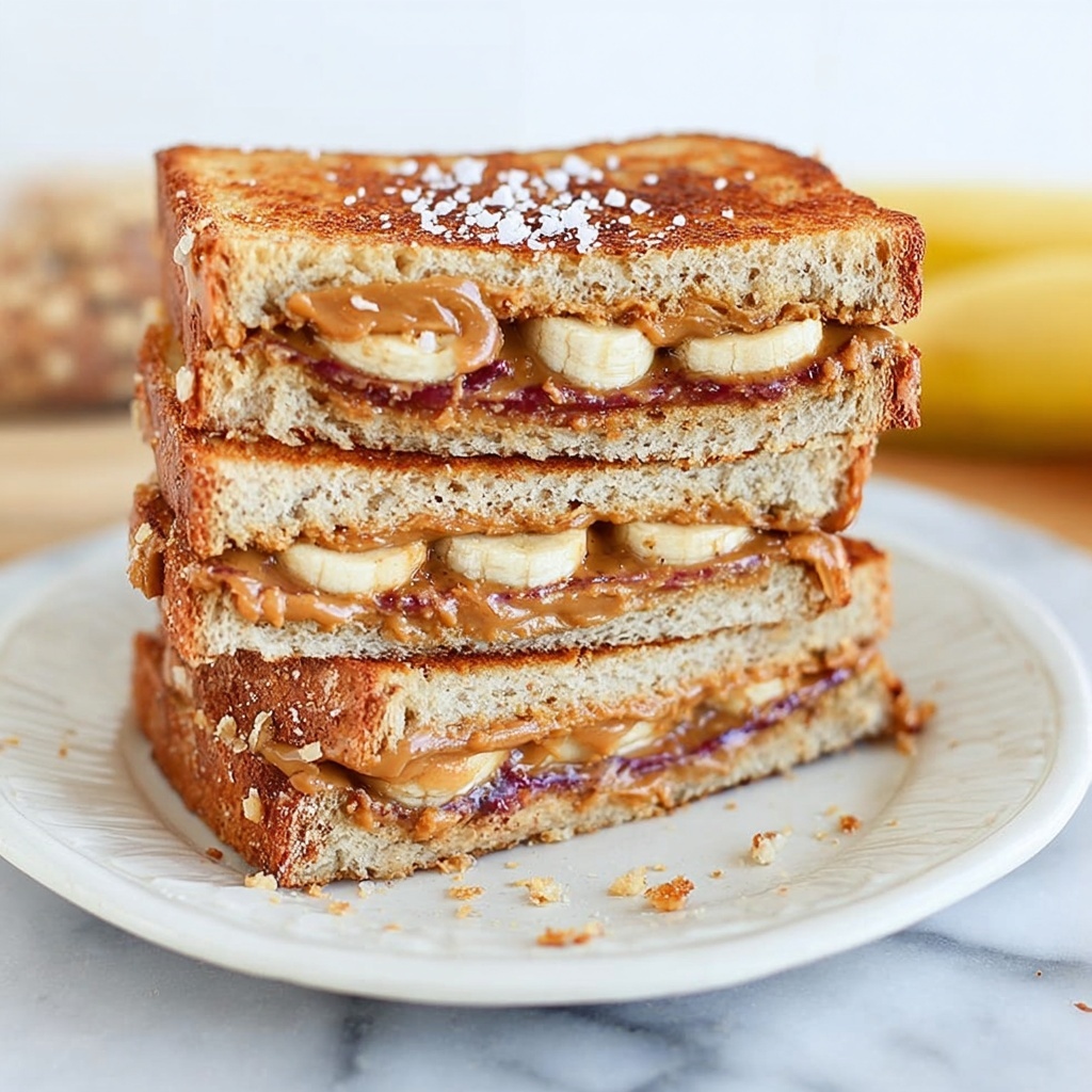 A deliciously warm and melty grilled sandwich combining creamy peanut butter and sweet bananas, perfect for a quick snack or a kid-friendly treat. This recipe features ripe bananas and whole wheat or white bread, grilled to golden perfection with a hint of cinnamon and honey for extra flavor.
