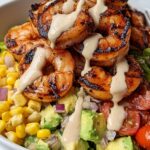 This Grilled Shrimp Bowl with Avocado, Corn Salsa & Creamy Garlic Sauce is a vibrant, flavorful dish combining tender, seasoned shrimp grilled to perfection with a zesty corn salsa, creamy garlic sauce, and fresh avocado. Perfect for a quick, healthy lunch or dinner, this recipe balances smoky, spicy, and creamy elements for a satisfying meal.