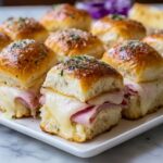 Ham and Swiss Hawaiian Roll Sliders are a delicious, savory snack perfect for gatherings and parties. Featuring sweet Hawaiian rolls filled with layers of ham and Swiss cheese, topped with a flavorful butter, Dijon mustard, and poppy seed glaze, these sliders are baked to golden perfection. They are easy to prepare and sure to be a crowd-pleaser.