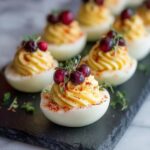 Garnirsh like fresh herbs and whole cranberries do more than just decorate your deviled eggs—they contribute fresh bursts of flavor and eye-catching color. Parsley offers a clean earthiness while dill adds a subtle brightness. A few extra chives sprinkled on top lend vibrant green appeal and a mild onion scent that elevates every bite.