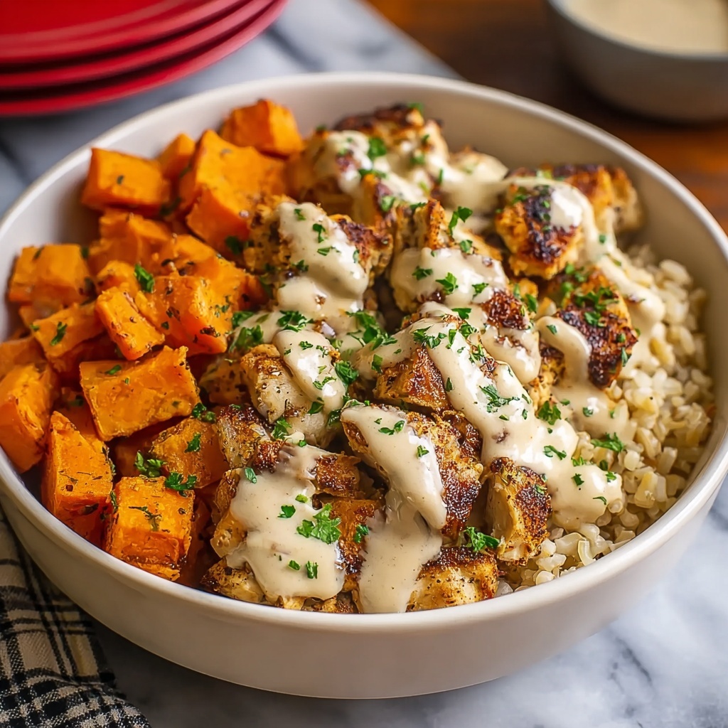 Add a pinch of cayenne pepper to the chicken seasoning or top your bowl with sliced jalapeños or a drizzle of hot sauce for a spicy kick that pairs wonderfully with the sweetness of the potatoes.
