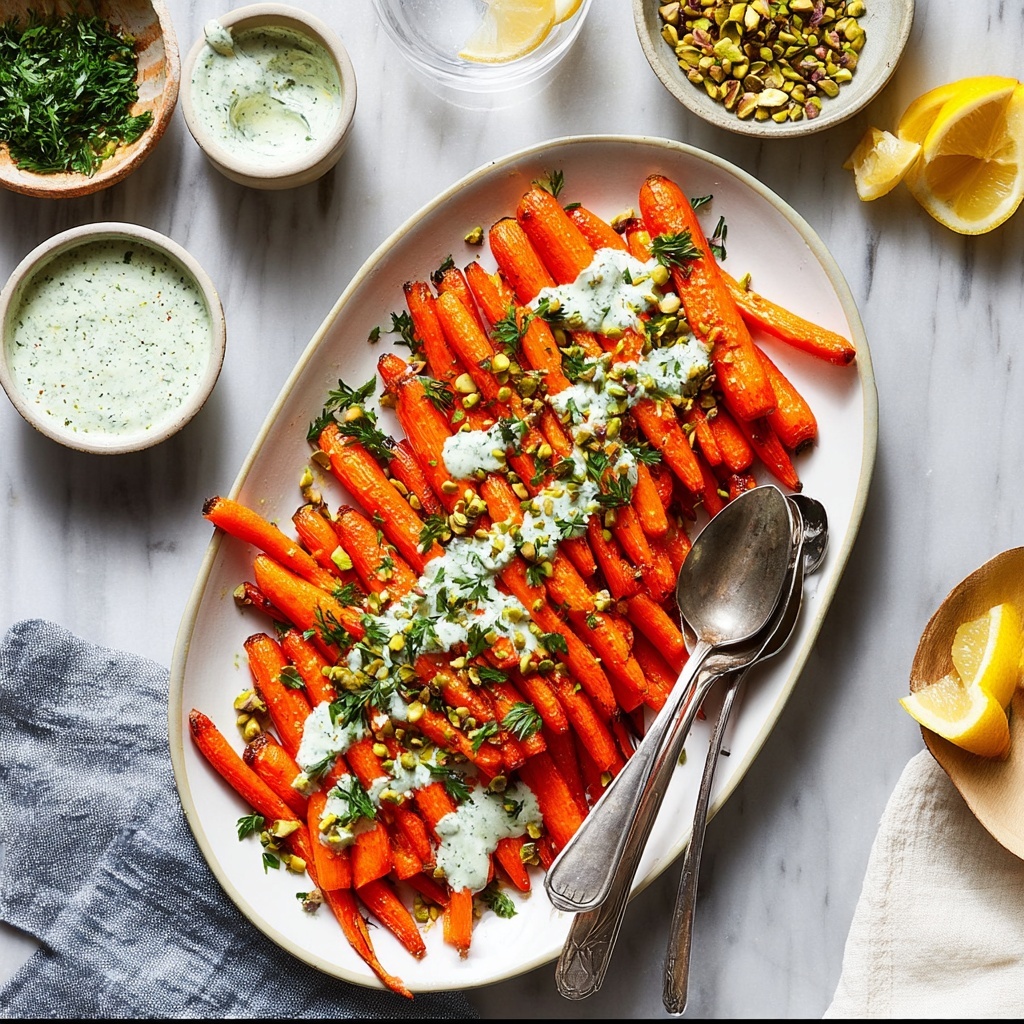 Once your carrots have finished roasting, transfer them to a serving dish and generously drizzle the lemon yogurt sauce over the top. For a little extra crunch and visual appeal, sprinkle with chopped pistachios, some fresh parsley, and a pinch of red pepper flakes if you like an extra kick. This finishing touch adds texture and color, making every bite a joy.