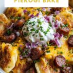 This Kielbasa and Pierogi Bake is a hearty, comforting dish perfect for a satisfying meal. Featuring tender pierogi layered with savory browned kielbasa and sautéed onions, topped with creamy sour cream and melted cheddar cheese, this bake combines bold flavors and simple ingredients for an easy yet delicious dinner.