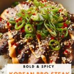 Delicious Korean BBQ Steak Rice Bowls featuring tender marinated flank steak grilled to perfection, served over fluffy white rice, and topped with a spicy, creamy sauce and fresh green onions. This flavorful dish combines sweet, savory, and spicy elements for a satisfying meal that’s ready in just 45 minutes.