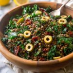 This vibrant Lemon Pesto Lentil Salad combines tender green lentils with nutrient-packed kale, flavorful olives, sun-dried tomatoes, and a zesty lemon pesto vinaigrette. The salad is enhanced by the fresh herbaceous notes of basil and parsley, crunchy Marcona almonds, and a creamy umami twist from nutritional yeast and white miso, making it a refreshing and protein-rich dish perfect for a light lunch or a wholesome side.