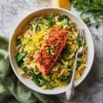 This Lightened-Up Salmon Orzo Pasta with Lemon is a quick and healthy meal perfect for busy weeknights. Featuring tender pan-seared salmon served over orzo pasta tossed with sautéed garlic, shallots, spinach, fresh dill, and a bright lemony dressing, this dish combines vibrant flavors with nutritious ingredients for a satisfying and wholesome dinner.