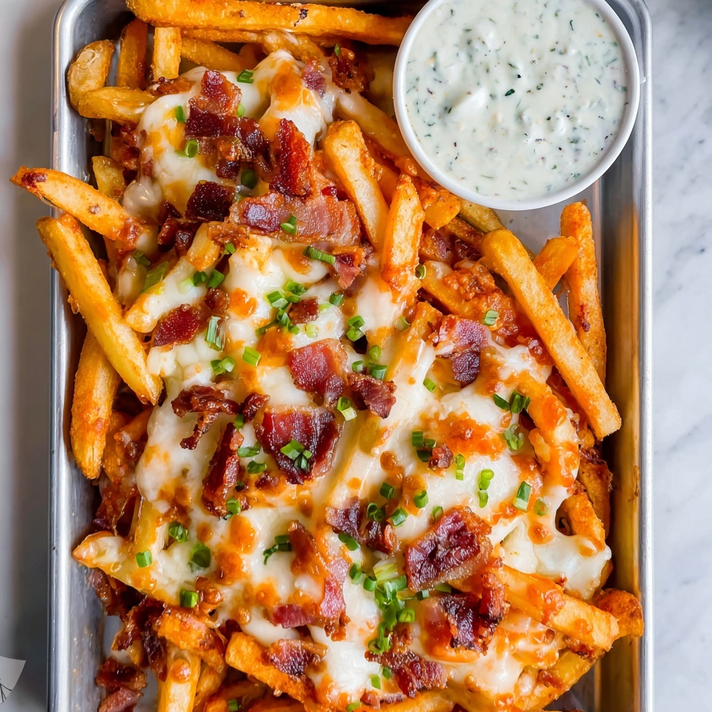 Loaded Cheese Fries are a deliciously indulgent snack featuring crispy golden fries topped with melted cheddar cheese, savory bacon, fresh green onions, and optional rich brown gravy and sour cream. Perfect for sharing, these fries combine crunch, gooey cheese, and bold flavors for a satisfying treat.