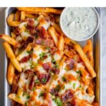 - For air frying, cook the fries according to the air fryer manufacturer’s instructions until crispy, then proceed with adding cheese and bacon toppings and melting under the broiler as directed.