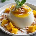 This Mango Coconut Panna Cotta is a refreshing, tropical dessert that combines creamy coconut layers with vibrant mango puree. Perfectly set and topped with fresh mango slices, toasted coconut flakes, and mint leaves, this no-bake treat is elegant and easy to prepare, making it ideal for warm-weather entertaining or a delightful ending to any meal.