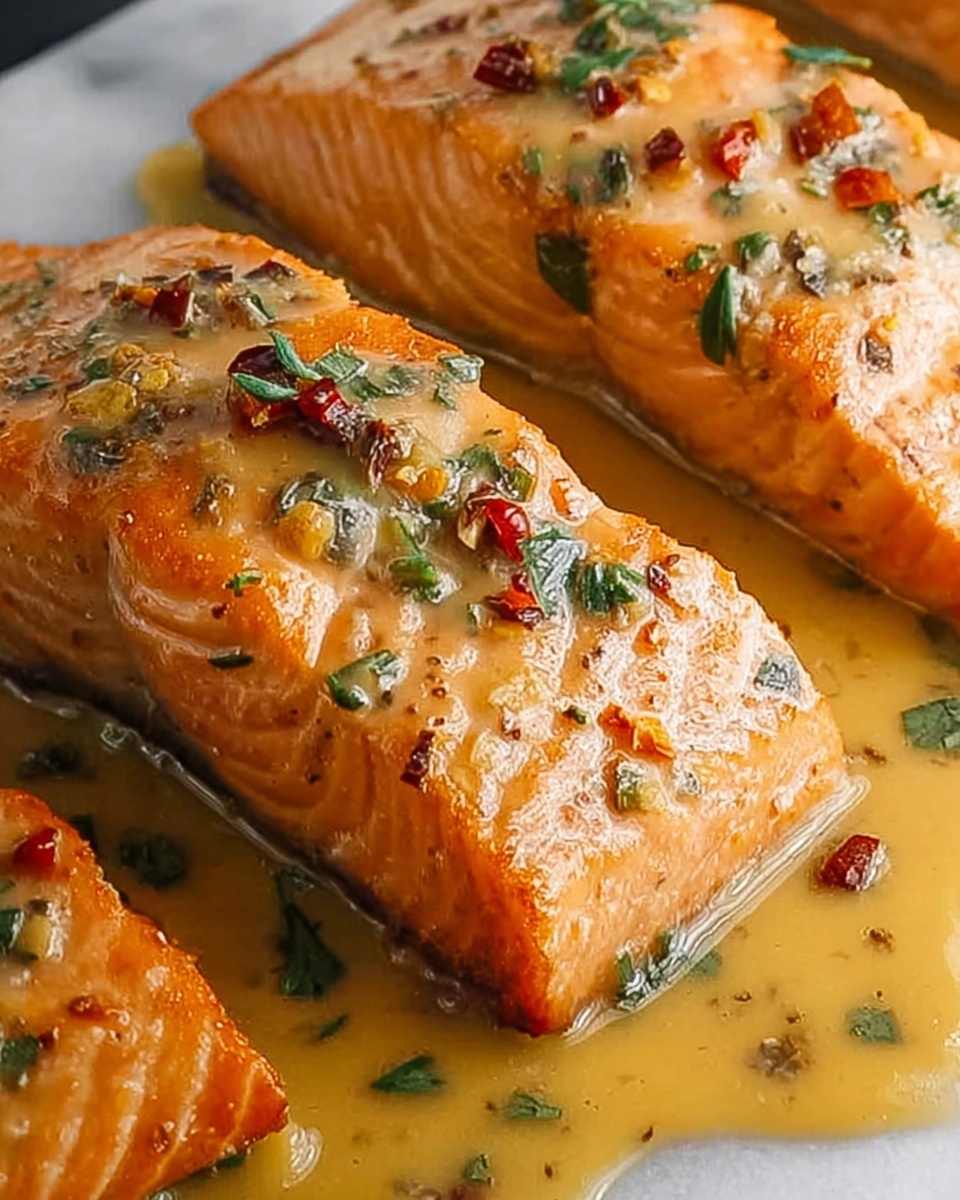 - Simmer Salmon in Sauce: Return the salmon fillets to the skillet, spooning sauce over them. Let the salmon simmer in the sauce for 2-3 minutes to absorb the flavors.