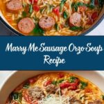 This Marry Me Sausage Orzo Soup is a hearty and flavorful dish featuring savory Italian sausage, tender orzo pasta, fresh vegetables, and a touch of aromatic herbs. Perfect for a cozy meal, this soup combines the richness of browned sausage with the wholesome goodness of spinach and Parmesan garnish, all simmered together in a well-seasoned chicken broth.