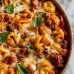 A hearty and flavorful Meat Lovers Pizza Tortellini combining tender tortellini pasta with a savory blend of Italian sausage, ground beef, and rich pizza sauce, all topped with melted mozzarella cheese and classic pepperoni slices. Perfect for a comforting and easy-to-make dinner that satisfies pizza cravings in a unique way.