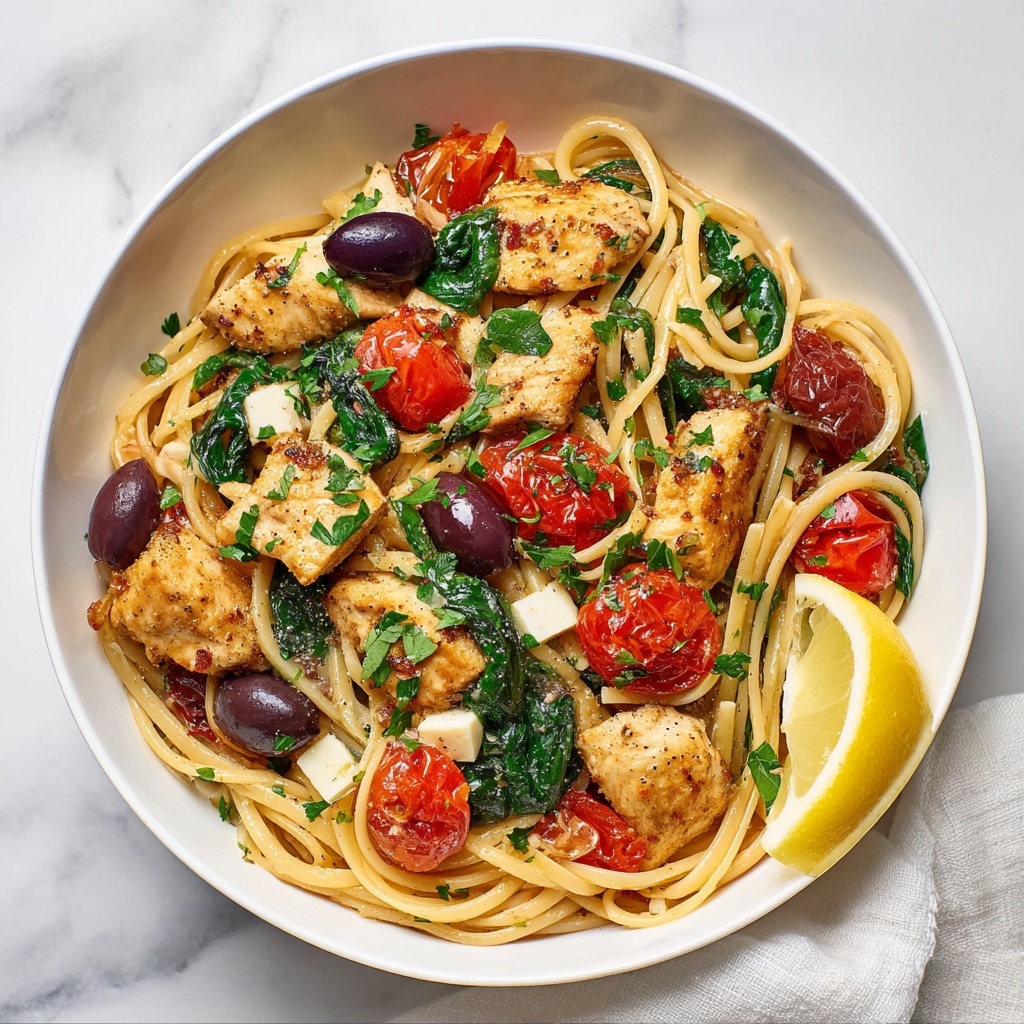 Once the pasta is nearly done, stir in the baby spinach, halved cherry tomatoes, and kalamata olives. Cook just a minute more to soften the spinach without losing its vibrant color. Finally, add the sliced chicken back in along with fresh lemon juice, gently mixing to heat everything through and brighten the overall dish with citrus notes.