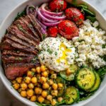 This Mediterranean Steak Bowl combines tender marinated sirloin steak with fresh and vibrant Mediterranean flavors, including homemade tzatziki, roasted chickpeas, and a zesty vinaigrette. Perfect for a balanced and delicious meal, it features hearty grains, crisp vegetables, and a creamy yogurt sauce that brings the bowl together.